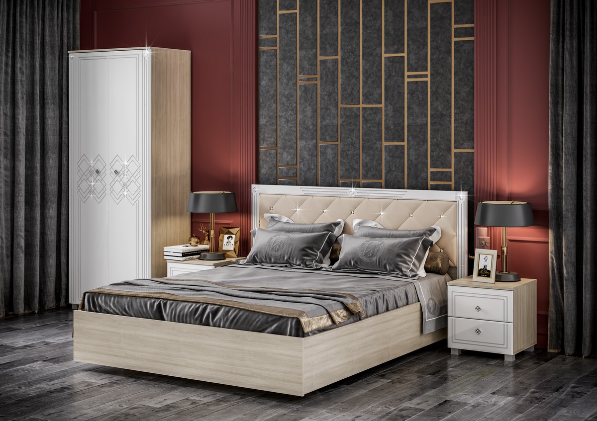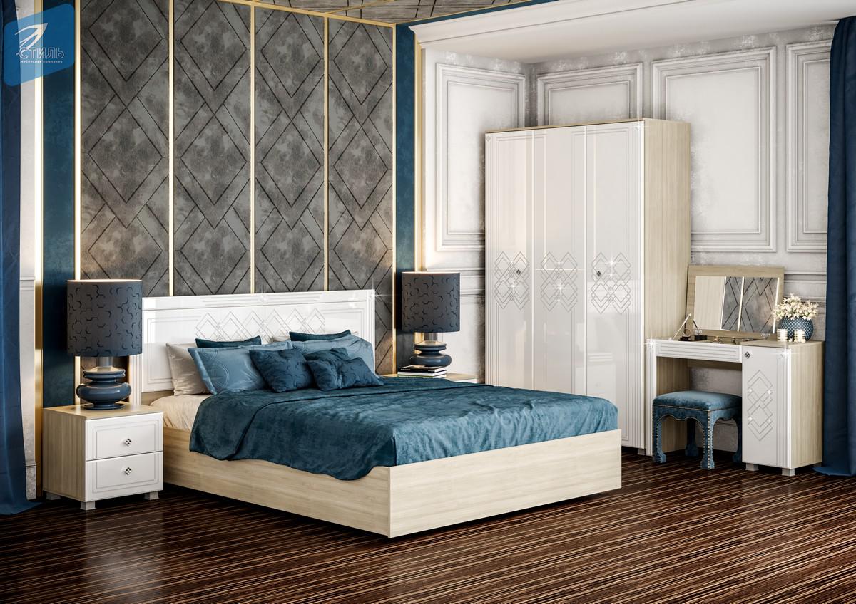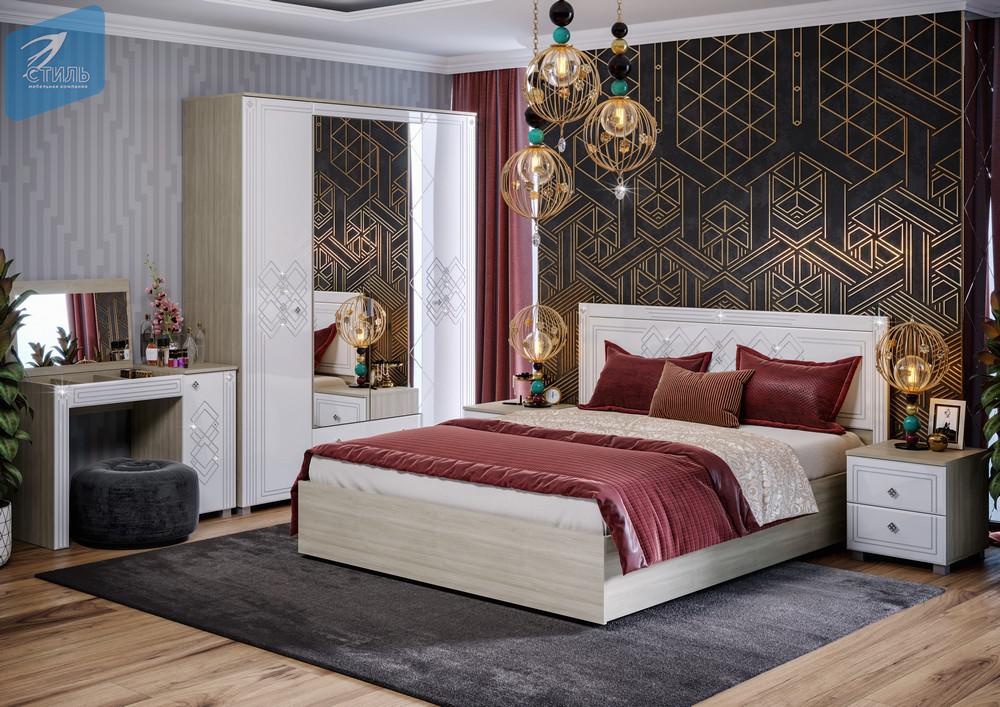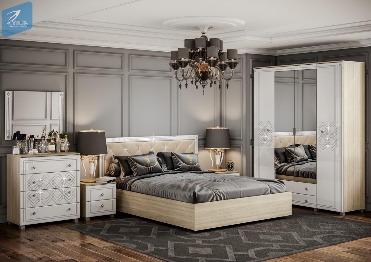 Спальня Амели - это изысканная композиция из 8-ми модулей, которые идеально впишутся в любой интерьер и в комнату любого размера. Элегантный стиль, оригинальная фрезеровка фасадов с кристаллами Swarovski и широкий модульный ряд мебели Амели сделают спальню неповторимой, а блеск зеркал и уникальный и неповторимый орнамент лишь подчеркнут ее роскошь. Возможные виды изголовья кровати: изголовье МДФ белый глянец и стразы и возможно мягкое изголовье экокожа крем и пуговицы-стразы.