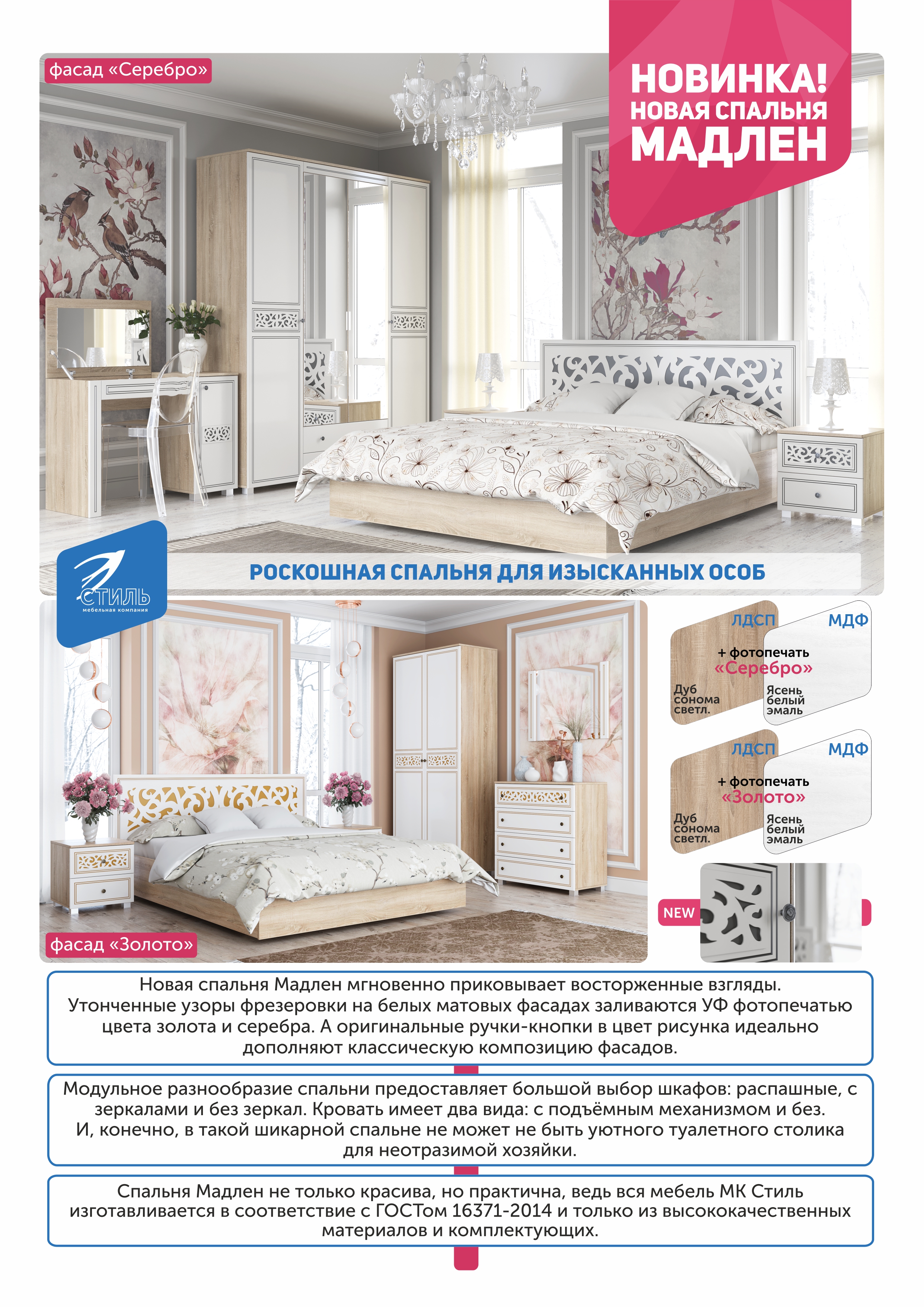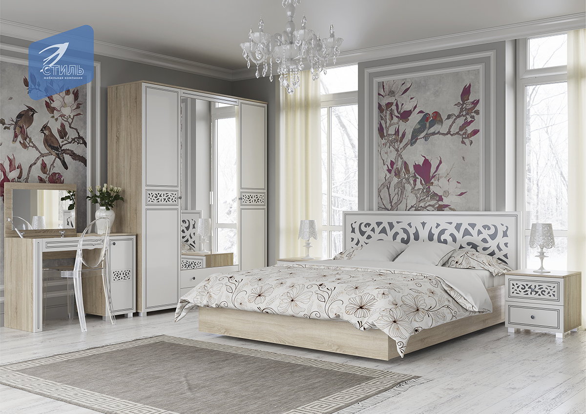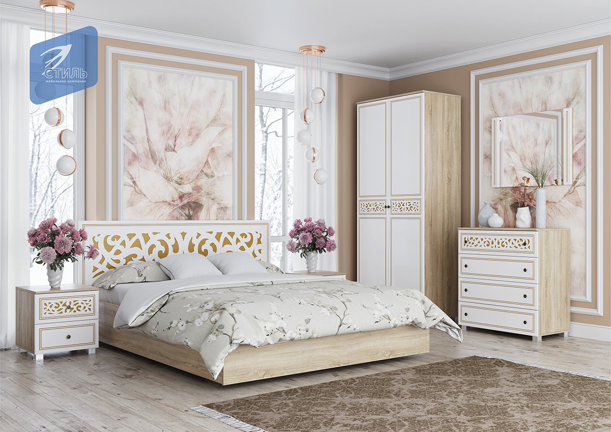Спальня "Мадлен" с фасадами "Серебро" и фасадами "Золото"