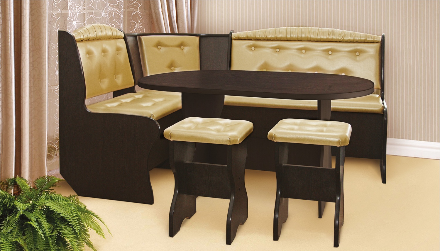 Кухонный угол Эффект полностью оправдывает своё название, так как выглядит он действительно эффектно и стильно. Увидев его, никто даже не подумает, что это мебель эконом класса. Ярким акцентом этого кухонного угла является удачное и наиболее модное сейчас сочетание цветов. Каркас мебели выполнен в чёрном цвете, а обивка – в молочном. В комплект входят угловой диван, два табурета и кухонный стол (сложенный и разложенный вариант использования стола). Диван отличается своей вместительностью – на нем запросто сядут пять или даже более человек. Компактный, но очень вместительный стол имеет красивую овальную форму, что придает дополнительный уют вашей кухне.