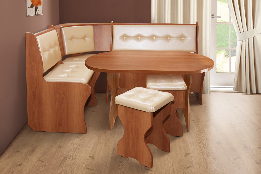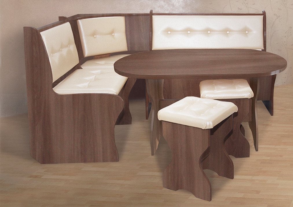 Ничто не дарит такого уюта кухне, как красивый кухонный угол. Среди мебели эконом класса прекрасным вариантом станет кухонный уголок Жасмин. Он выполнен в теплых оттенках светло-коричневого в сочетании с молочным цветом. В комплект входит удобный угловой диванчик, два табурета и компактный, но довольно вместительный стол овальной формы (сложенный и разложенный вариант использования стола). Табуреты и диван имеют мягкую и удобную обивку. Такой вариант подходит как для большой семьи, так и для людей, любящих принимать много гостей. Кухонный угол Жасмин станет любимым местом сбора всей семьи и друзей.