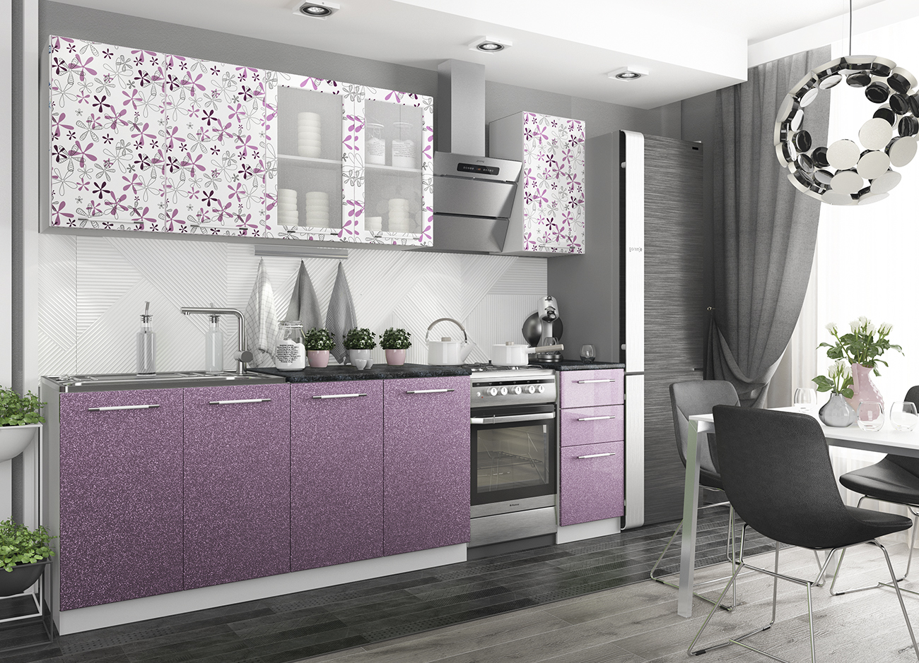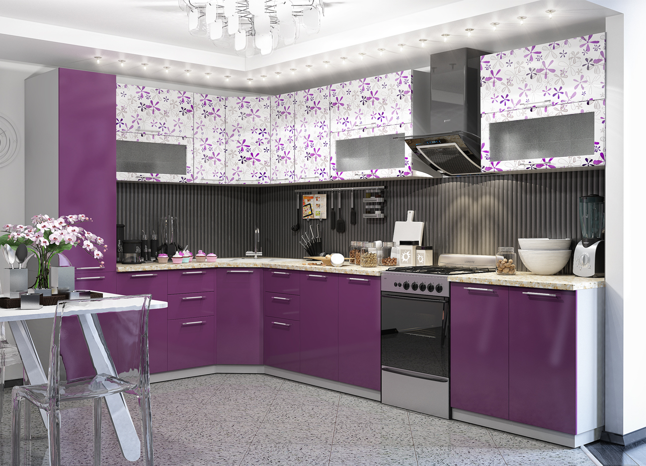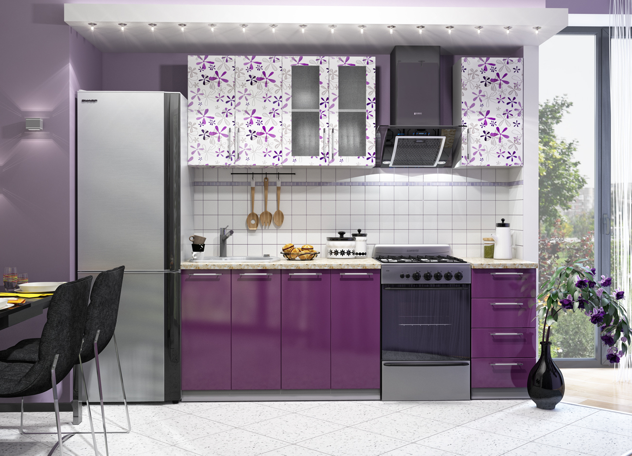 Элементы, входящие в состав кухонного гарнитура «Флора», изготовлены из качественных материалов с благородной патиной. Подобный выбор позволяет не только подчеркнуть статус, но и отразить индивидуальность хозяйки. Позвольте вашей кухне стать яркой и романтичной, ведь это подчеркнет ваш неповторимый вкус. Создайте в своем доме атмосферу тепла, умиротворения и уюта. В продаже можно найти модель в цветовом исполнении сирень металлик. Для изготовления фасадов применяется МДФ, корпуса — ЛДСП и стекло. В состав входят колонки декоративной разновидности. На последних имеется узор в виде цветка. Присутствуют разнообразные балюстрады. Подобные элементы выделяют преимущество кухни. Характерной чертой являются незакрытые полки, защитная решетка и уникальный витраж, добавляющий образу утончённость.