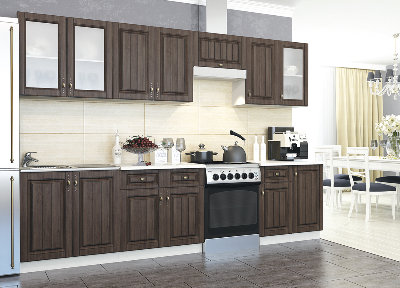 Темные фасады в сочетании с белыми деталями корпуса внесут в обстановку кухни благородство и элегантность. Отделанные стеклянными вставками верхние навесные шкафы сделают верхнюю линию кухонного комплекта более легкой и воздушной.