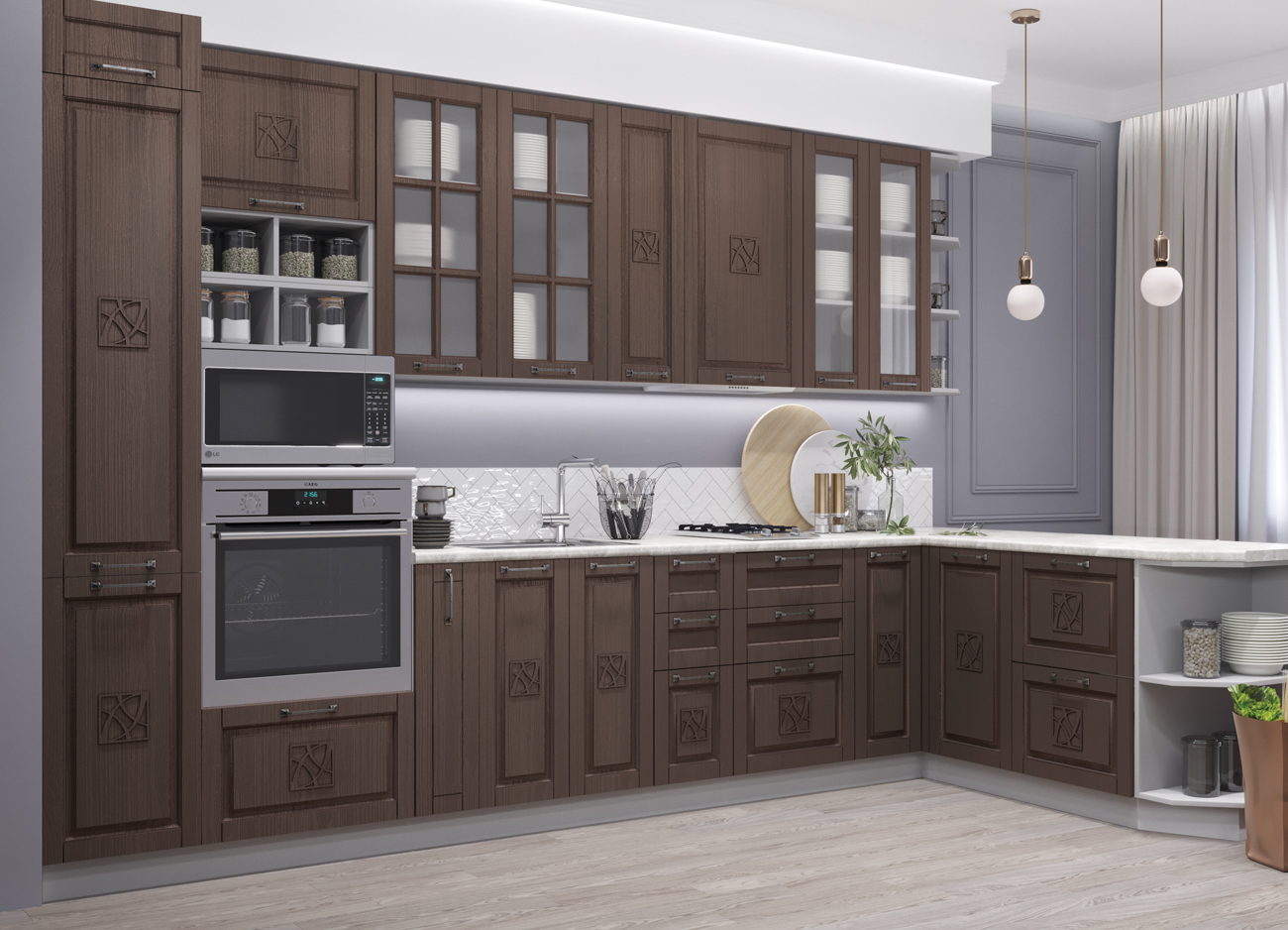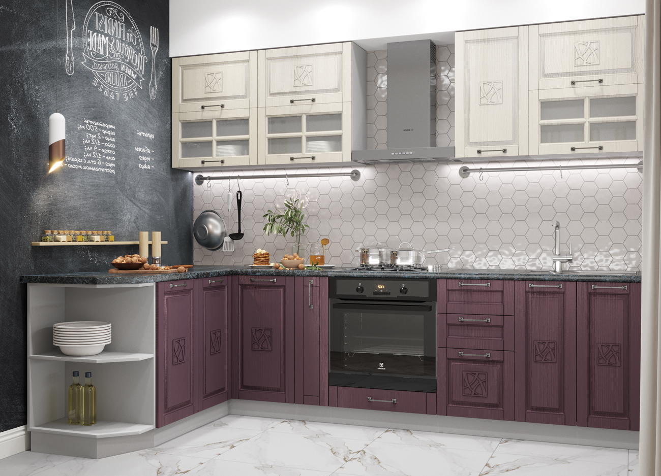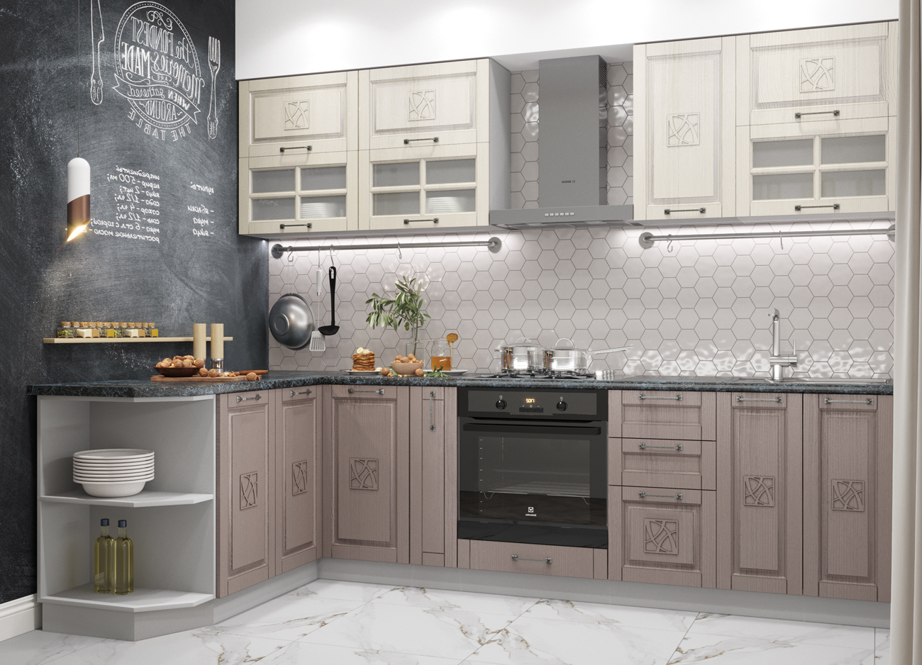 Также вы можете укомплектовать свою кухню необходимой бытовой техникой, которая будет подходить по стилю, цвету и функциональности. Это варочная панель, духовка, вытяжка, посудомоечная машина, мойка, смесители разных форм, в том числе отдельно стоящую технику.
