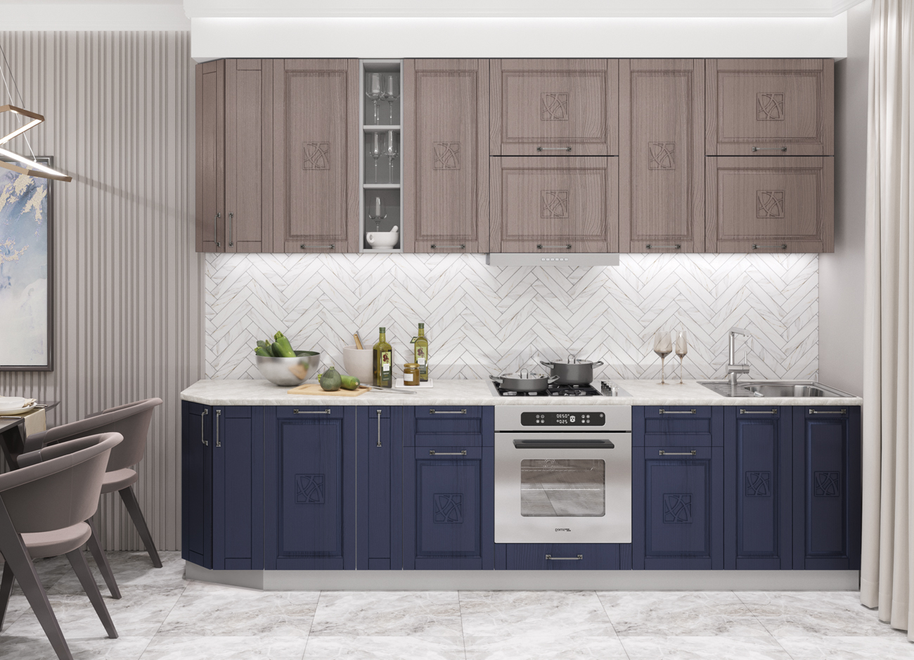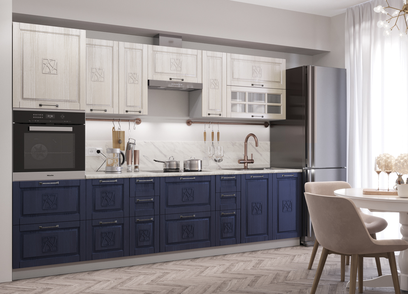 Отличительной характеристикой кухни «Тито», выполненной в неоклассическом стиле является оригинальное выделение центральной части помещения. Круглый обеденный стол, который размещается в центе помещения, создает органичный и благородный вид. Кухня «Тито» станет идеальным решением для любителей сдержанной роскоши, классических элементов и современных технологий. Неоклассика — это то, что можно всегда, поэтому кухня в таком стиле всегда будет иметь актуальный и современный вид. «Тито» позволяет сохранить традиционную уютную атмосферу в доме. Кухонный гарнитур, выполненный в классическом дизайне подойдет для людей, которые любят проводить время на кухне, проводить дружеские встречи и устраивать семейные вечера.