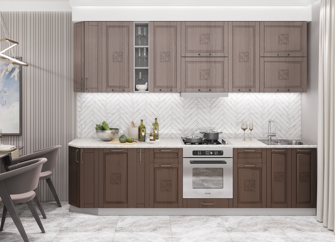 Кухонный гарнитур «Тито» – это сочетание традиционных и современных характеристик. Кухни в стиле неоклассики включают в себя оригинальные фасады с фрезеровкой, которые придают интерьеру аристократический и уравновешенный стиль. Встраиваемая техника не содержит винтажных имитаций и выглядит максимально естественно. Капучиновый, перламутровый, бронзовый и пурпурные тона добавляют ощущение чистоты и создают максимальный уют. По сравнению с традиционным стилем неоклассика органично сочетает элементы декора и современную бытовую технику на одном пространстве. Кухня «Тито» – это отсутствие лишних деталей, наличие изящных декоративных элементов, сдержанная и роскошная обстановка, симметрия, строгие геометрические формы и правильные пропорции. «Тито» станет идеальным решением для воплощения большого пространства. Кухонный гарнитур подойдет для просторных и светлых помещений, с высокими потолками и большими окнами. Такой вариант станет выгодным решением для обустройства коттеджей, загородных домов, элитных апартаментов.