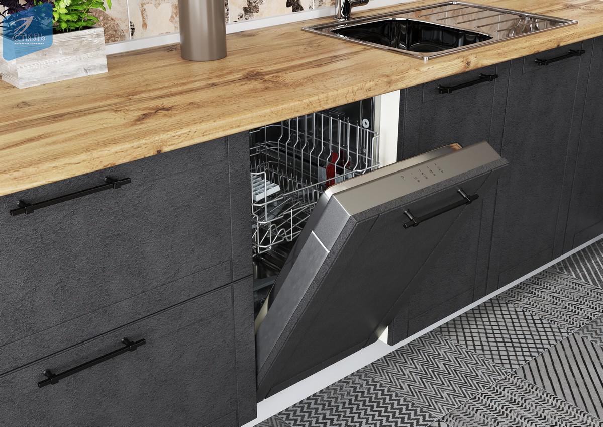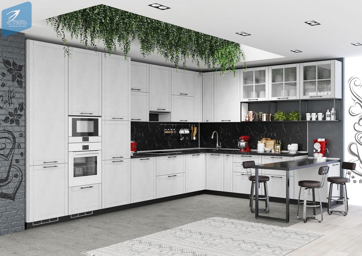 Сочетание красоты МДФ-фасадов «Дуб Артисан», «Бетон графит», «Бетон снежный», «Камень тёмный» и особо прочных столешниц «Мрамор Греческий», «Дуб Вотан», «Луна».