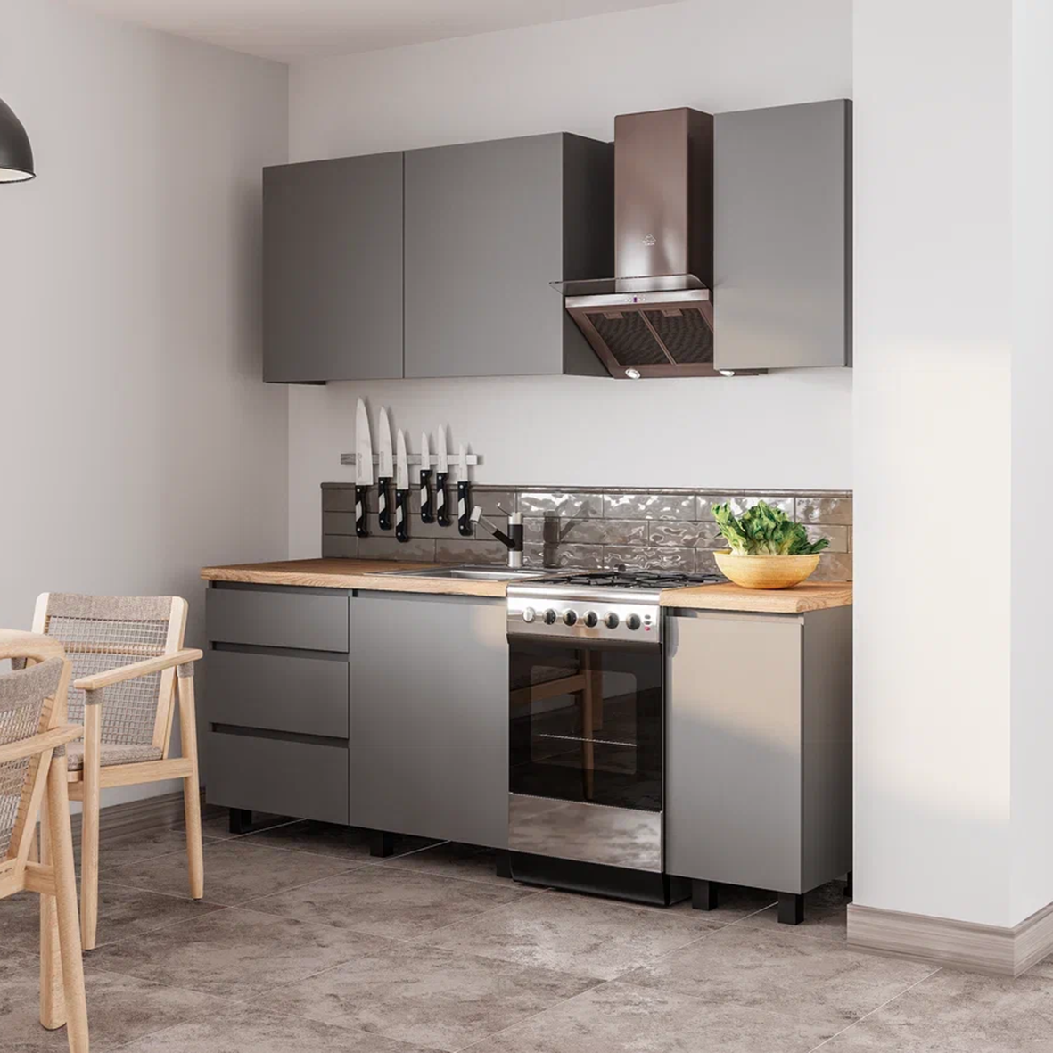 Дизайн кухни "Асти" вдохновлен трендом на минимализм. Прямые четкие линии, матовые фасады без декора и гармоничное сочетание всех блококв делает этот комплект универсальным.